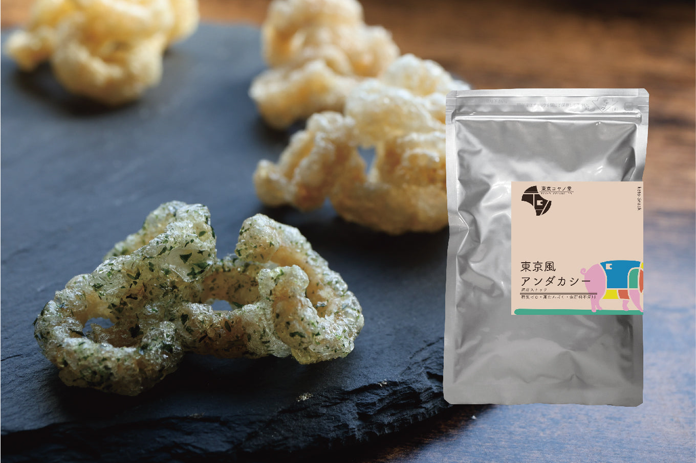 国産豚皮をこめ油で軽く揚げたスナック菓子です。当店ならではのサクサク食感に加え糖質オフ、高たんぱくでダイエット中の方のおつまみに最適なアンダカシー。